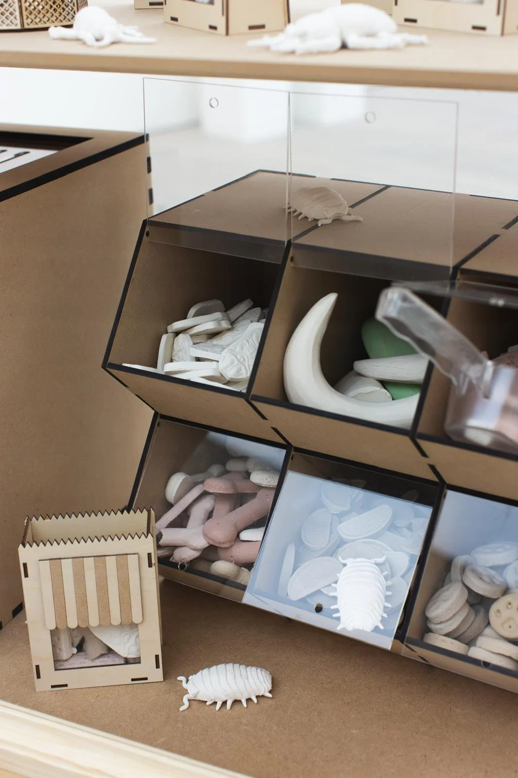 The opening act to this unfolding artistic cabaret, Rachel Mortlock’s Hagger & Son is unapologetic in its command of space. The work reconstructs a Victorian pet shop façade, supposedly well-stocked with the mass-manufactured dog treat Spratts. However, look closer and inside wriggle uncanny sub- stitutes. Everything here is a reproduction - creepy-crawlies, pet food and popular chocolate treats all cast in pastel-coloured jesmonite. Revealing the mechanics which underscore modern life, the work echoes Baudrillard’s theory of the simulacrum that ‘reality’ has now become only ‘‘that which is al- ways already reproduced’. Signifiers of both human and animal consumption collapse into one another within the skeletal storefront, revealing to the viewer the constructed stage on which the capitalist illusion plays out.